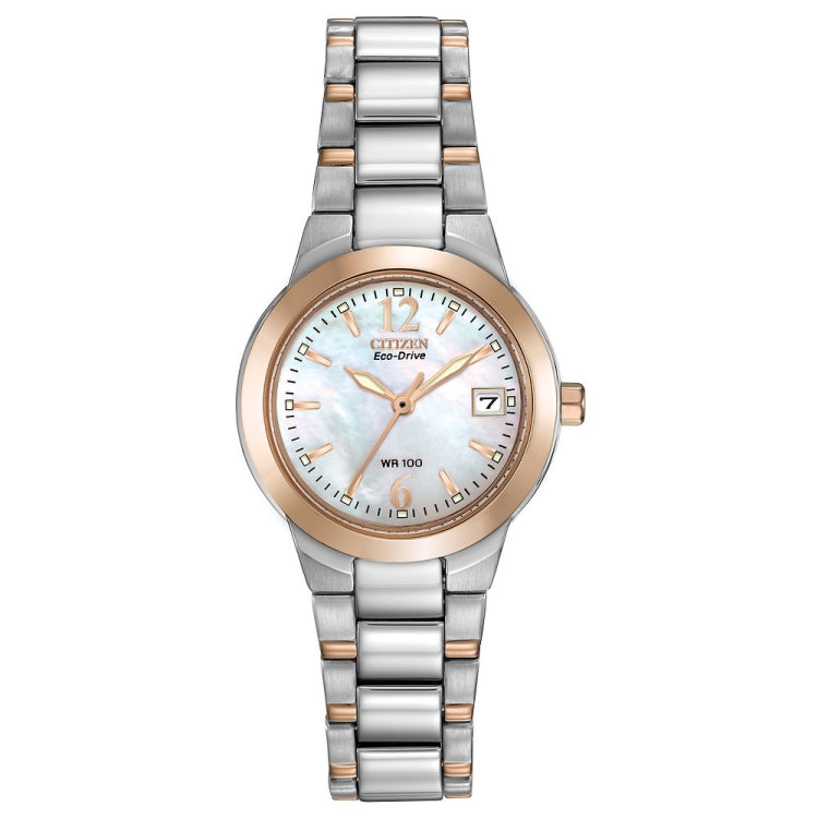 The surprise of a mother-of-pearl dial lends this ladies' sport watch a extra feminine touch. Ever practical, this stainless steel two-tone 3-hand model with 26mm case also features luminous hour and minute hands, a date indicator, foldover clasp with push-button, and 100 meter water resistance. Featuring our Eco-Drive technology – powered by light, any light. Never needs a battery. Caliber number E011.